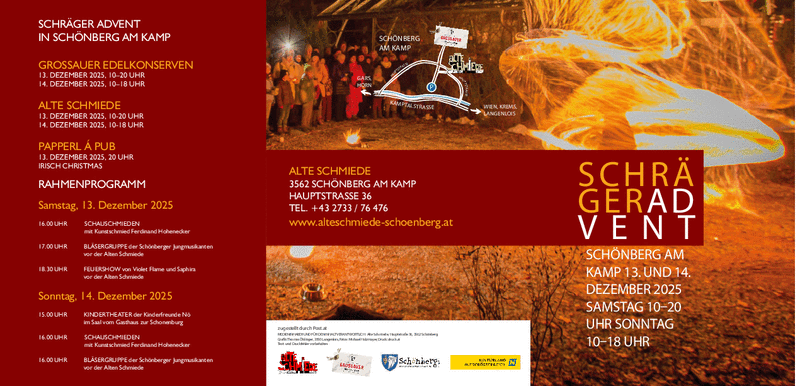 Freuen Sie sich auf faszinierende Schauschmieden, stimmungsvolle Musikdarbietungen der Bläsergruppe der Schönberger Jungmusikanten sowie ein unterhaltsames Kindertheater, das unsere Kleinsten begeistern wird. Zum Ausklang sorgt eine beeindruckende Feuershow für ein magisches Erlebnis in der Adventszeit.
