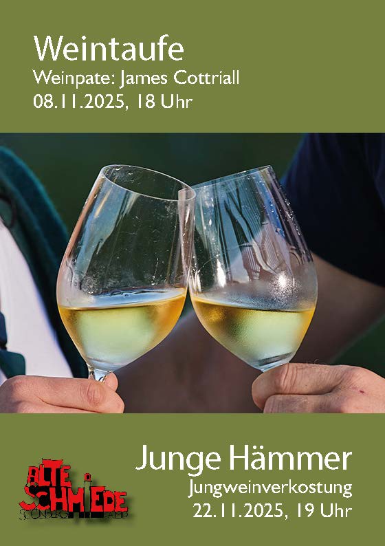Am 8. November 2025 laden wir herzlich zur feierlichen Weintaufe in die Alte Schmiede ein. Der neue Jahrgang vom Weingut Oskar Hager wird an diesem Abend von Weinpate James Cottriall offiziell getauft. Die Segnung des Weines wird von Diakon Thomas Pfeiffer vorgenommen.